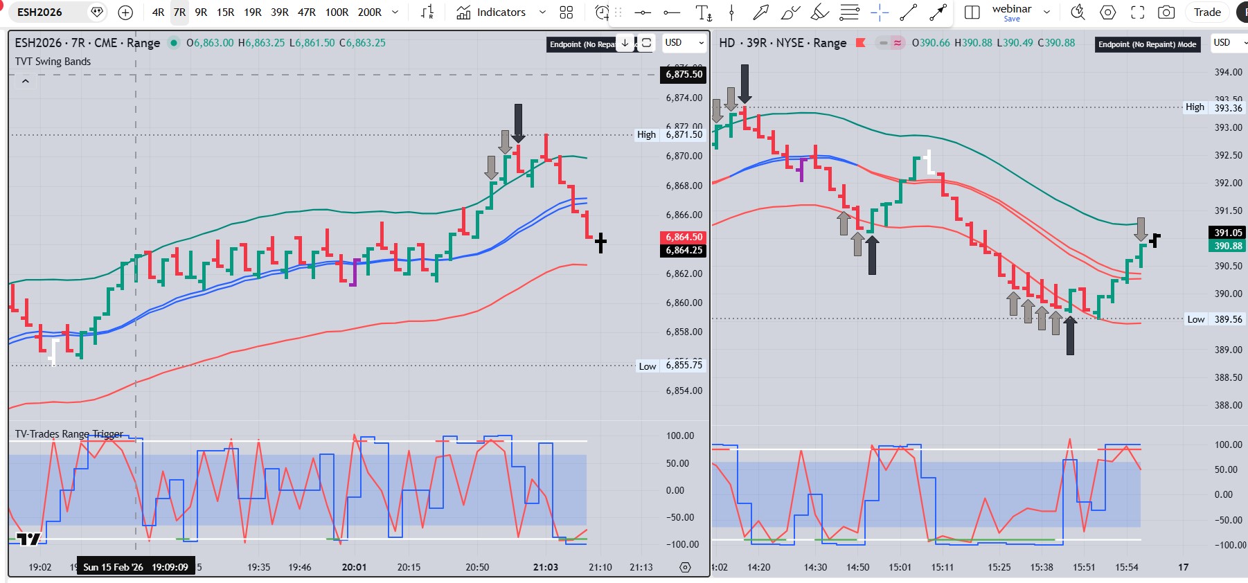 Real Example: Synthetic Divergence with TVT Swing Bands showing multiple profitable trade entries on ES Futures and HD Stock